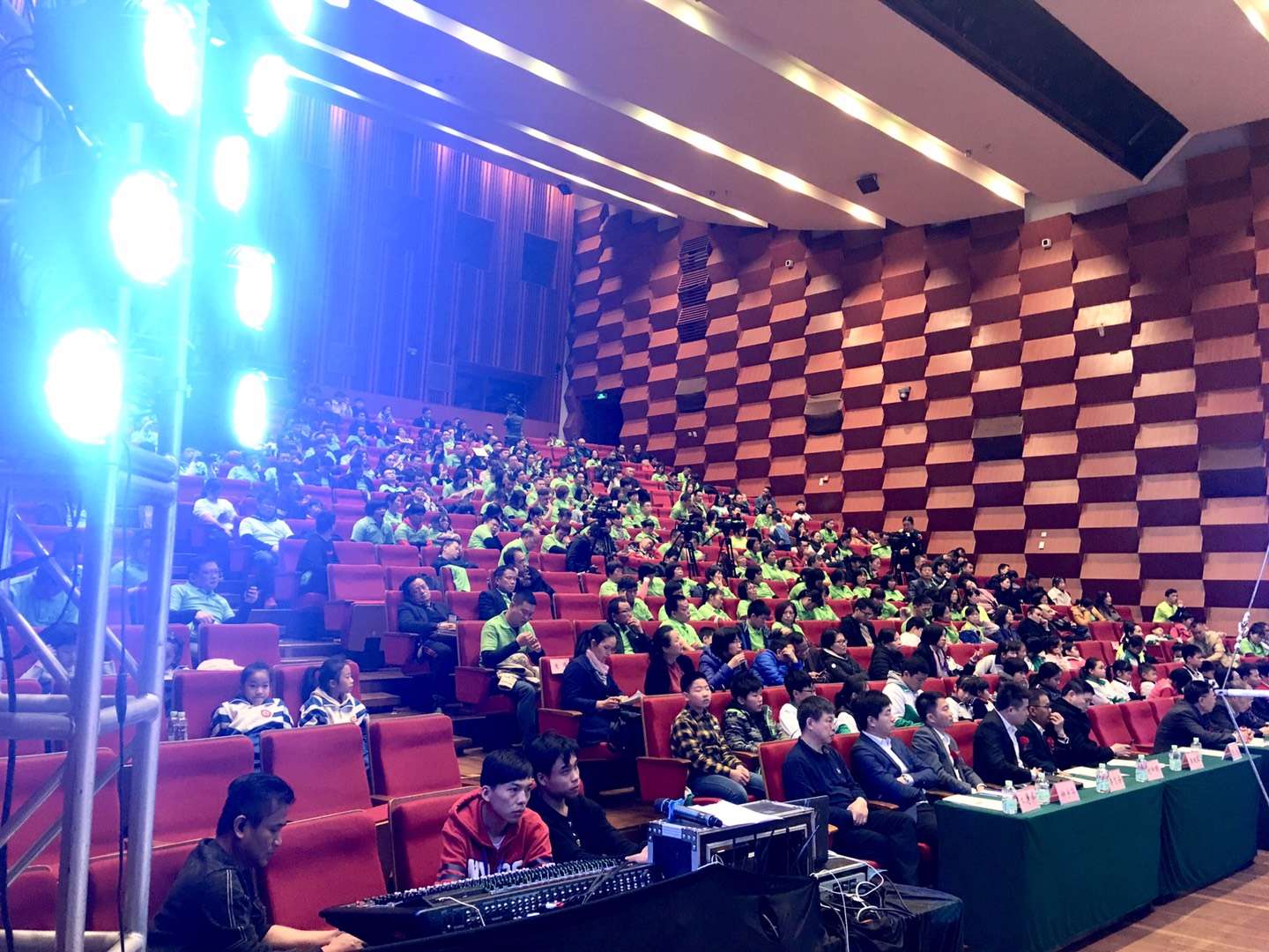 通常在舞臺后區做一面燈光墻,面向觀眾置于演員表演區后面。地面可以設置搖頭光束燈、大功率激光燈,以一定的仰角面向觀眾席后上方投射光束,也可用窄光束AC筒燈向舞臺兩側前方投射光束,并做跑燈變化。燈墻的燈具可以選擇窄光束LED投光換色燈向舞臺表演區正投,或使用窄光束LED投光換色燈在燈光墻里面向舞臺兩側投射,產生具有沖擊力的舞臺視覺效果。